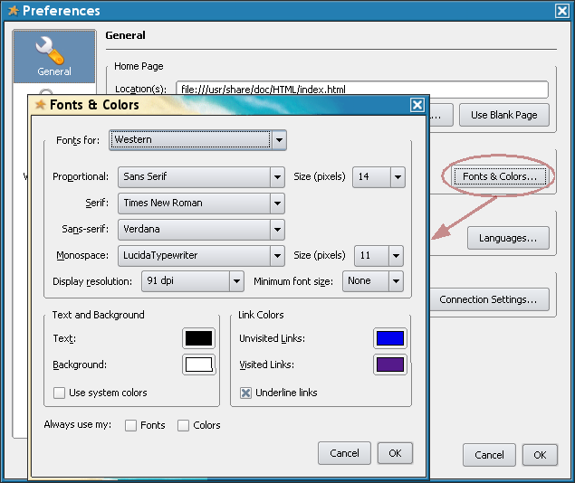 So we Edit->Preferences and then Fonts & Colors , and selected Verdana 14px for general browsing and LucidaTypewriter 11px for monospace text.