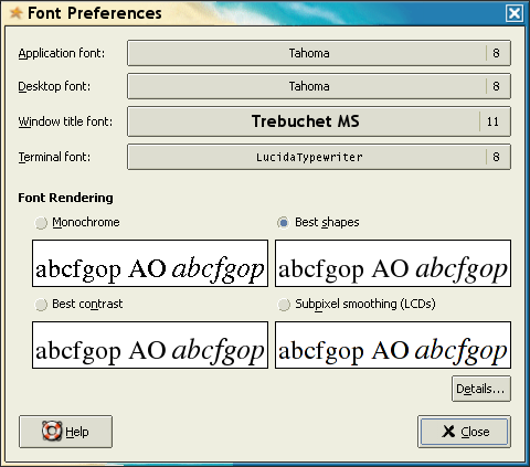 So we basically chose Trebuchet 12pt as the window title font, the bitmap font LucidaTypewriter 8pt for fixed size text, and Tahoma 8pt for everything else, which includes menus, buttons, etc. The 2 first should follow your taste, but Tahoma 8pt for all the rest is the optimal configuration, also used by MS Windows 2000 and XP.