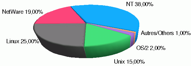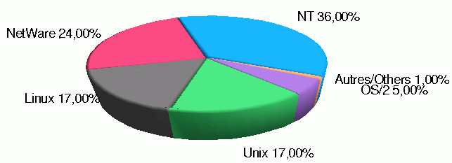 Studies from IDC bring to light the irresistible rise of Linux as a server operating system. In 1998, Linux is credited with 17% of market share, with an increase of 212%, which is the most important in that domain. The following graphics give the whole market share repartition.