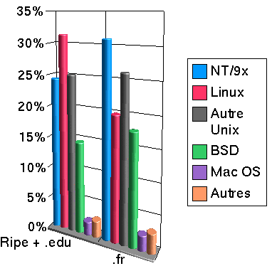 The Net itself produces marketing tools to demonstrate the superiority of free software. Counters are regularly updated by Netcraft and others, on web server software, and another was done by IOS Counter for the servers on Internet. Results, reproduced below, show the importance taken by Apache with more than 16 millions of operational sites (among them 30% run Linux), crushing the competition, as well as the free operating systems Linux and *BSD which dominate the world of Internet servers.