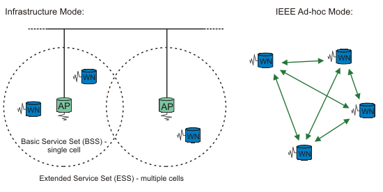 Infrastructure mode: The wireless network consist of at least one access point (AP) connected to the wired network and a set of wireless nodes (WN). This configuration is called a Basic Service Set (BSS). Extended Service Set (ESS) is a set of two or more BSSs (multiple cells).