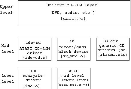 This diagram glosses over some of the differences between the protocol stacks. CDROM device names are not maintained by the uniform CDROM layer but rather by each individual protocol stack. In the case of the SCSI subsystem, device names are maintained by the sr driver while the IDE subsystem maintains device names with its central "ide" driver (i.e. not by the ide-cd driver). USB and IEEE1394 cd devices names are maintained by their respective stacks. This may partially explain why the /dev/cdrom is often a symbolic link to the appropriate subsystem's device name.