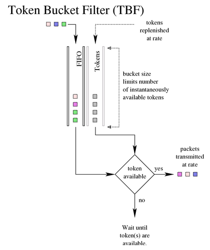 This qdisc is built on tokens and buckets. It simply shapes traffic transmitted on an interface. To limit the speed at which packets will be dequeued from a particular interface, the TBF qdisc is the perfect solution. It simply slows down transmitted traffic to the specified rate.
