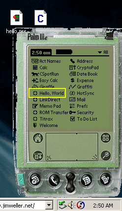 Here's some pics and screen shots of the emulator (running under windows) running hello.prc (compiled under linux). You'll note the name of the app is what was specified on the build-prc command line. I also tested the hello.prc file on my PalmIIIe. It Works!