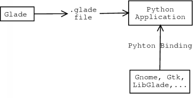 The following graph shows this general mechanism. To understand how the Pyhton binding is implemented, it's sometimes necessary to look at the Gtk, Gnome, LibGlade Python modules located in PYTHONPATH in order to compare them to the C Gtk/Gnome developer documentation.