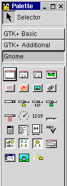 After starting Glade, you will get two windows. One is a widget tool box, called Palette. Form this one you can select the categories of widget among GTK+ Basic, GTK+ Additional and Gnome. If you don't have the Gnome widget, Glade may have been compiled without Gnome support. Check the configure of the source Glade package, configure --help explains the configuration options.
