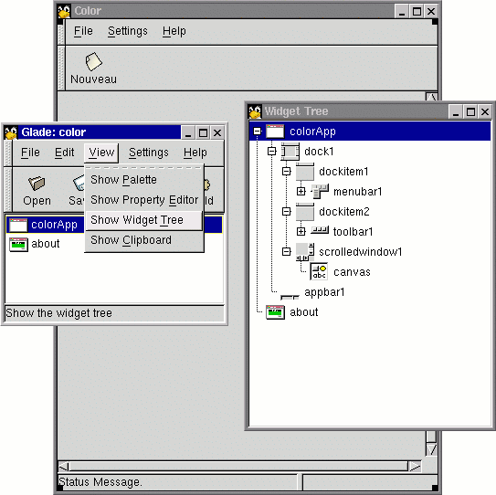 With Glade, we first create a Gnome Application Window. This widget is a window with menu bar & tool bar. Both are packed on the handled dock. On the bottom of the Gnome Application Window there is also already packed a status bar. After creating a Gnome Application Window, open the Widget Tree dialog (you will find it in the view menu in Glade). Now you can explore what is exactly packed in this widget.