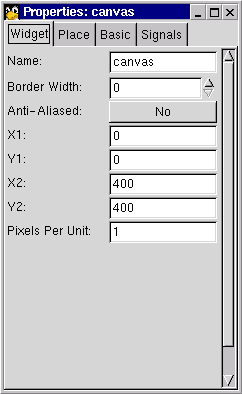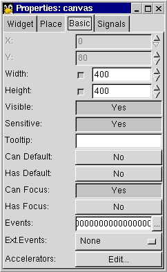Next add a canvas in the main area of the Gnome application widget. From the properties dialog, set its maximal coordinates to 400 and its maximal height and width to 400.