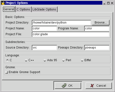 Call the Project Options from the Options button in the Glade toolbar. In the General sheet, adjust the project entries as below: